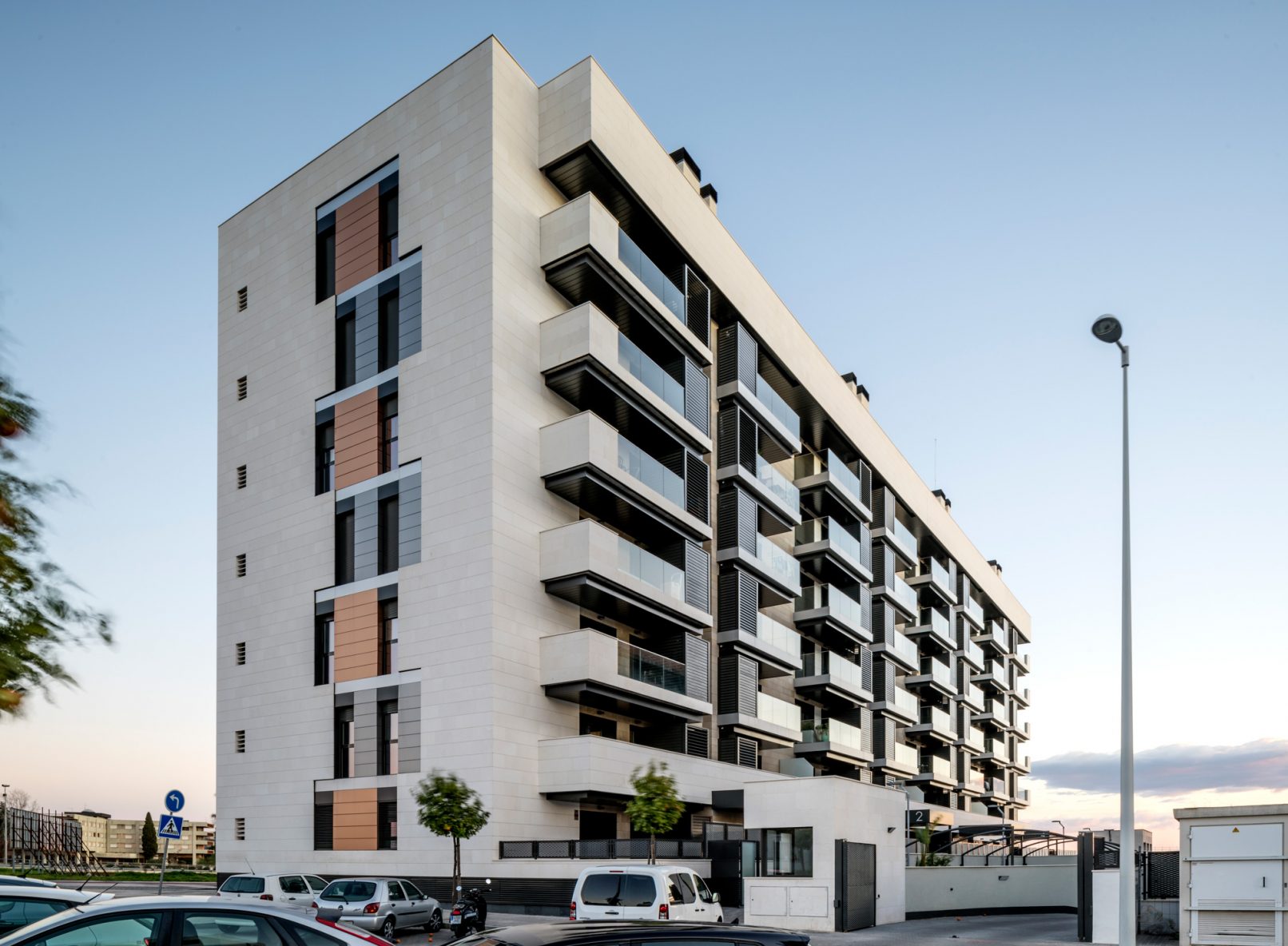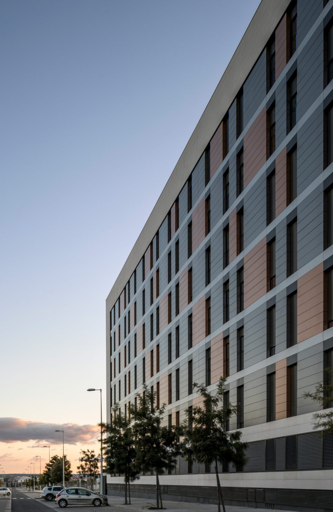 EL proyecto cuenta con 56 viviendas, las máximas fijadas por la normativa, ordenándose en 7 plantas (B+VI) con 8 viviendas cada una. La tipología dominante es la de 3 dormitorios (38udd), reservando los extremos para las de 4 dormitorios (14udd).