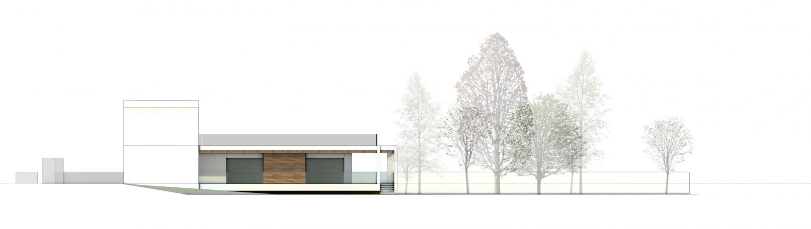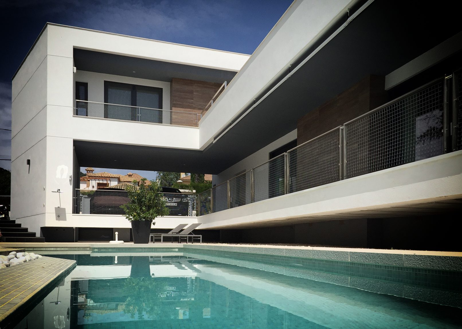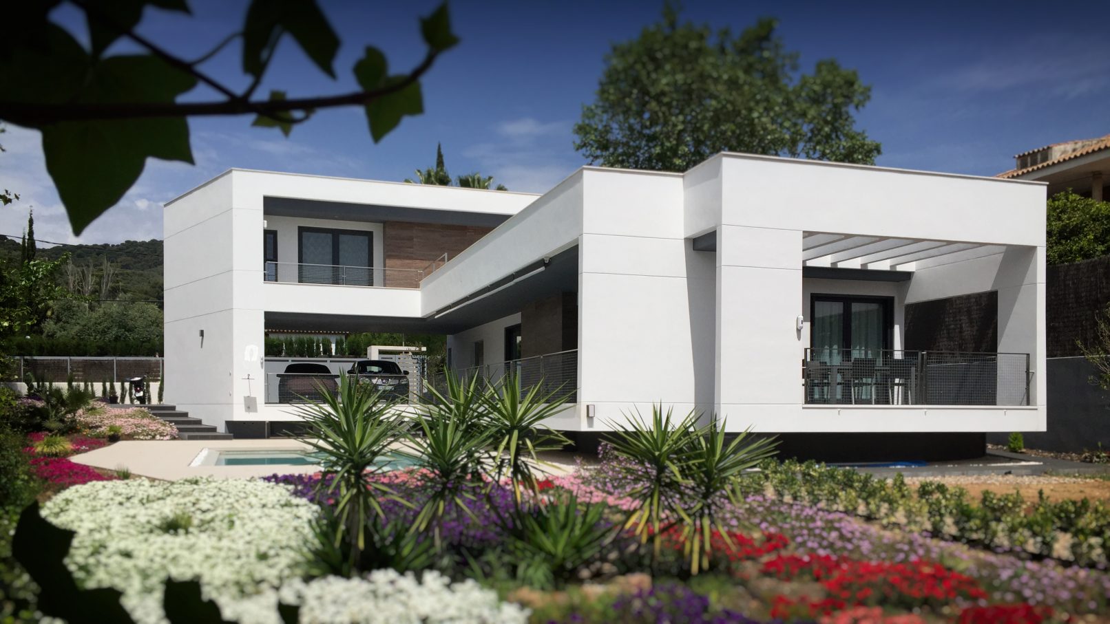 Formalmente la edificación responde a la unión de dos prismas, uno en planta baja donde se sitúa la zona más pública de la vivienda, como salón, cocina y terrazas, y otro en planta primera donde se sitúa la zona privada compuesta por un dormitorio principal y uno secundario. Este último prisma más pequeño que el primero, además de situarse sobre el anterior se encuentra girado 90 grados sobre éste de manera que el techo del prisma inferior se convierte en una gran terrazas de la planta primera. El nivel más bajo de todos coincide con la zona de piscinas y jardín que mantendrá las cotas actuales del terreno.